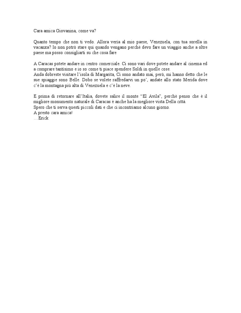 Lettera in inglese esame terza media sulle vacanze estive ... - ScuolaZoo Abbiamo provato a pensare a un argomento che potrebbe essere tra i più quotati per questa prova in inglese: si tratta di una lettera a un amico sulle vacanze estive o su un viaggio. Se pensi che all'esame di terza media 2017 ti cimenterai con questa traccia, allora non ti resta che leggere questa nostra guida dettagliata allo svolgimento in ... Lettera in inglese su un viaggio per l'esame terza media 2023 LETTERA IN INGLESE SU UN VIAGGIO PER L'ESAME DI TERZA MEDIA Per scrivere una buona lettera in inglese sul tuo ultimo viaggio in vista dell' e s ame di terza media, devi cercare di parlare... Scrivere Testo di un Viaggio (Gita Scolastica) in Inglese È un testo in inglese che parla di un viaggio o meglio di una gita scolastica a Malta, può essere utilizzato come spunto, ad esempio modificando la descrizione geografia, togliendo l'esperienza vissuta e mettendone un'altra più personale. Per capire cosa c'è scritto in modo da poterlo modificare adeguatamente copiatelo ed incollatelo su Google Traduttore.